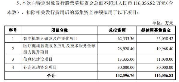 公司此次募资净额拟用于智能机器人研发及产业化、医疗健康智能设备应用及技术服务全球能力提升、信息化建设、补充流动资金等项目。